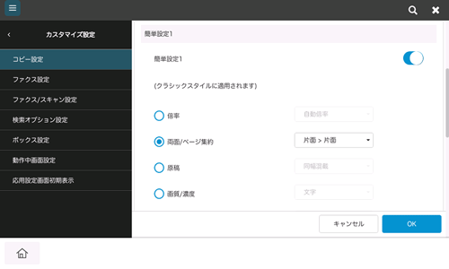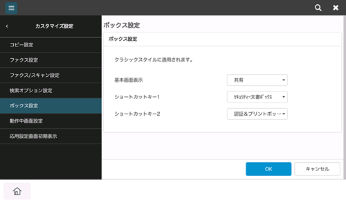A. クラシックスタイルのコピーモードおよびボックスモードでは、よく使う設定をショートカットキーとしてトップ画面に表示できます。