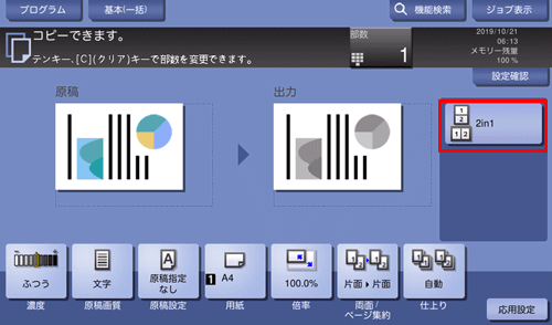 コピーモードのトップ画面にショートカットキーが表示されます。