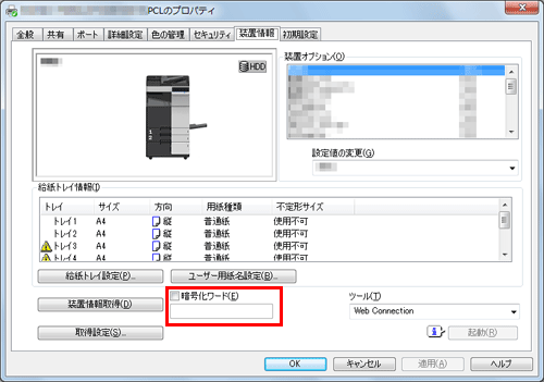 OpenAPIを介した通信をSSLで暗号化し、プリンタードライバーからの装置情報の自動取得ができる状態であれば、暗号化ワードを本機から取得できます。OpenAPIを介した通信をSSLで暗号化する方法について詳しくは、こちらをごらんください。