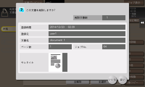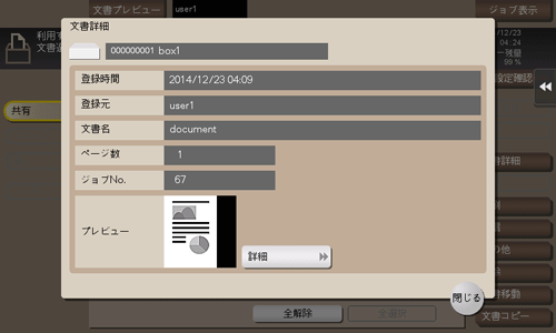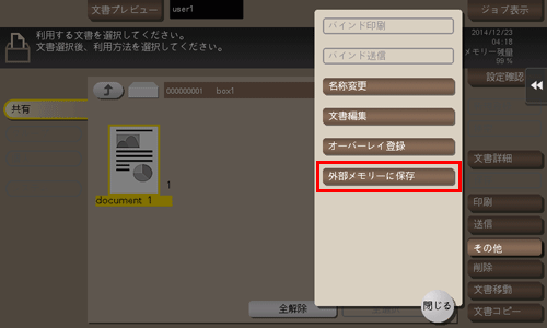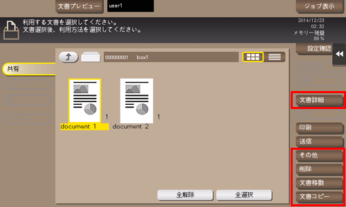 ファイルを選んでから[文書コピー]をタップすると、ファイルを他のボックスへコピーできます。コピー先のボックスは共有/個人/グループボックスから選べます。コピー先のボックスを選び、[実行]をタップするか、またはスタートを押します。