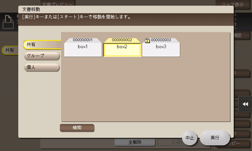 ファイルを選んでから[文書移動]をタップすると、ファイルを他のボックスへ移動できます。移動先のボックスは共有/個人/グループボックスから選べます。移動先のボックスを選び、[実行]をタップするか、またはスタートを押します。