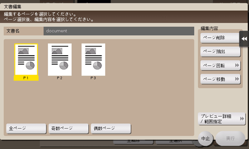 [ページ抽出] | 選んだページを抽出します。削除したいページが多い場合、残したいページだけを選択することにより、多くのページを選択して削除する必要がなくなります。 ページをロングタップしてメニューアイコンを表示し、 |