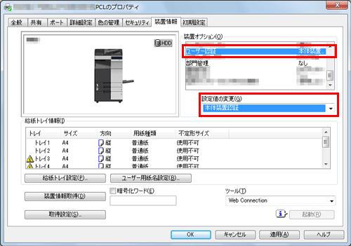 [装置情報]タブの[装置オプション]で[ユーザー認証]または[部門管理]を選び、[設定値の変更]から目的の項目を選びます。