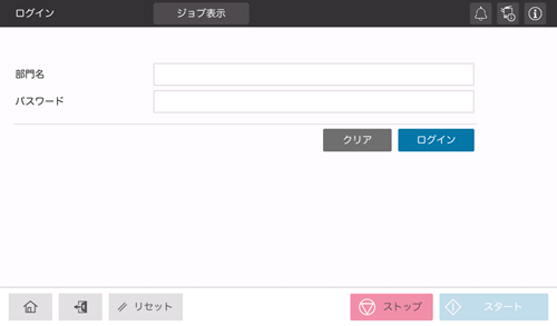 本機で部門管理が設定されている場合は、ログイン画面が表示されます。部門名とパスワードを入力し、部門認証を実施します。