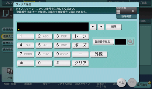 宛先のファクス番号を入力します。[登録番号指定]をタップすると、ファクス宛先の登録番号で指定することもできます。