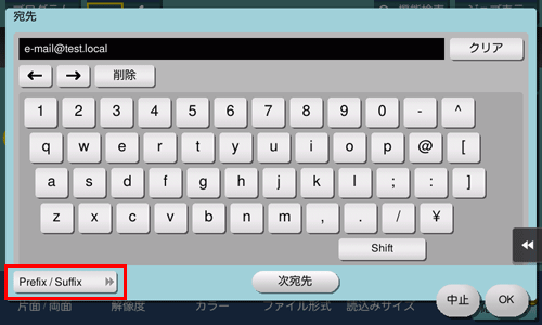 [アドレス入力付加設定](こちら)が設定されている場合、[Prefix/Suffix]が表示されます。登録されているドメイン名などを呼出して、入力を補完できます。