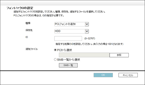 [ID] | PCLフォントまたはPCLマクロの場合は、フォント/マクロのID番号を入力します。 入力しなかった場合は、登録可能なID番号を、本機が自動的に割当てます。 |