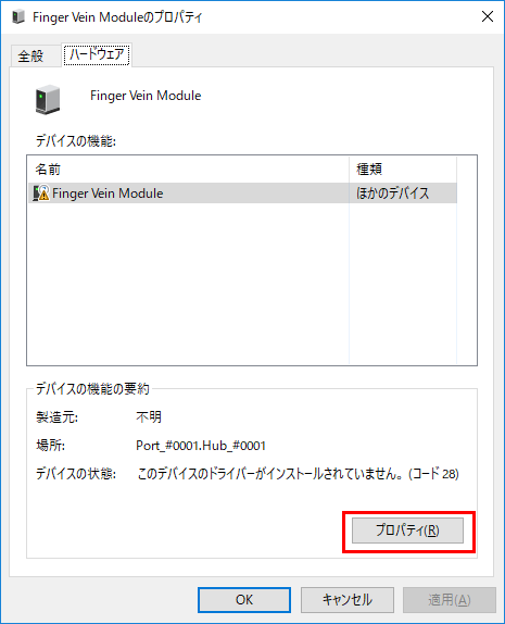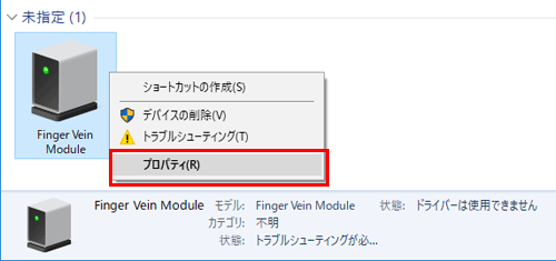 [未指定]カテゴリーに表示されている指静脈生体認証装置のデバイス名(もしくは[不明なデバイス])を右クリックし、[プロパティ]をクリックします。