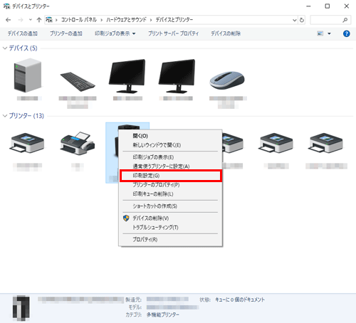 インストールしたプリンターのアイコンを右クリックし、[印刷設定]をクリックします。
