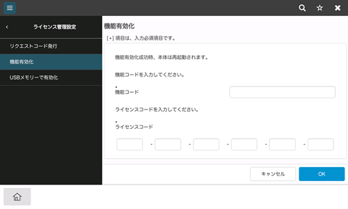 7. Web Connectionの管理者モード(または本機の[設定メニュー]-[管理者])の[メンテナンス]-[ライセンス管理設定]-[機能有効化]-[機能コード、ライセンスコードによる機能有効化]で、LMSのWebサイトで発行された機能コードとライセンスコードを、本機に登録します。