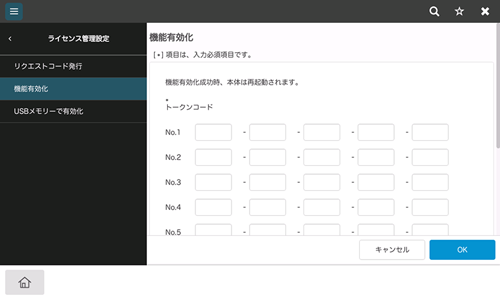 2. Web Connectionの管理者モード(または本機の[設定メニュー]-[管理者])の[メンテナンス]-[ライセンス管理設定]-[機能有効化]-[トークンコードによる機能有効化]で、トークンコードを入力します。