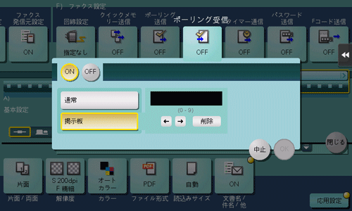 掲示板ボックスに登録されているファイルを受信するときに選びます。受信したいファイルが登録されている相手機の掲示板ボックスのボックス番号を入力します。