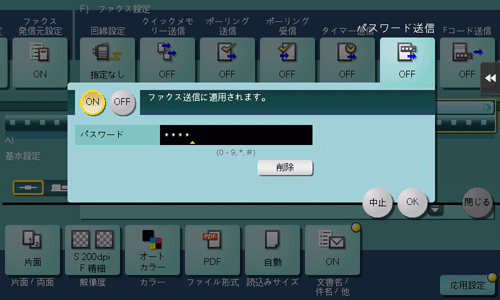 パスワードでファクスの通信相手を制限している(閉域受信機能を設定している)装置に対して、パスワードをつけて送信します。