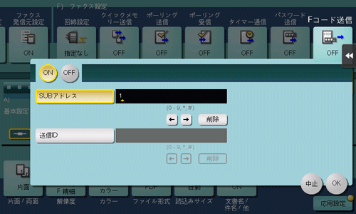 親展通信や中継配信を行うときに、Fコード(SUBアドレス、送信ID)を入力して送信します。