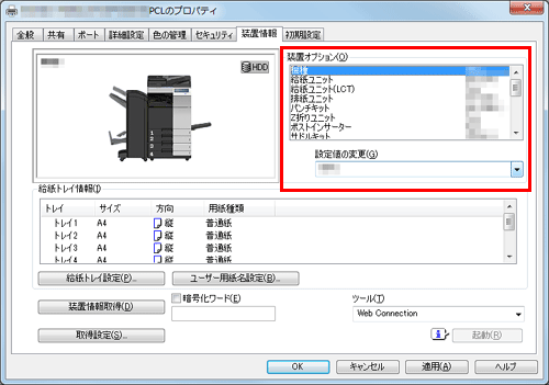 [取得設定...]の[自動取得]を無効にしている場合は、[装置情報取得]をクリックすると、本機の情報を取得して[装置オプション]に反映します。