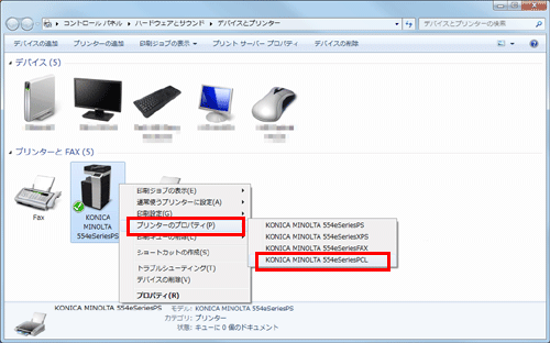 Windows 7/8/8.1/Server 2008 R2/Server 2012/Server 2012 R2の場合は、インストールしたプリンターのアイコンを右クリックし、[プリンターのプロパティ]から、表示されるプリンター名をクリックします。