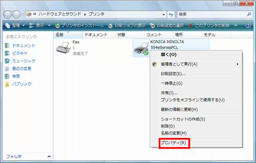Windows Vista/Server 2003/Server 2008 の場合は、インストールしたプリンターのアイコンを右クリックして[プロパティ]をクリックします。