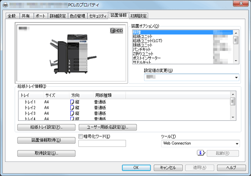 [装置情報取得] | 本機と通信してオプションの装着状態を取得します。 [取得設定...]で、本機の情報の取得方法を設定します。 | |