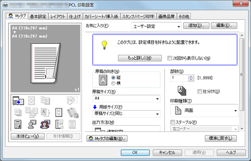 異なるタブに配置されている設定項目を[Myタブ]にまとめることができます。よく使う設定項目を[Myタブ]に登録しておけば、タブを切換えずに1画面でスムーズに設定変更ができます。