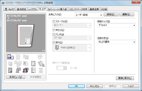 [仕上げ]タブでは、印刷物の仕上げに関する設定ができます。