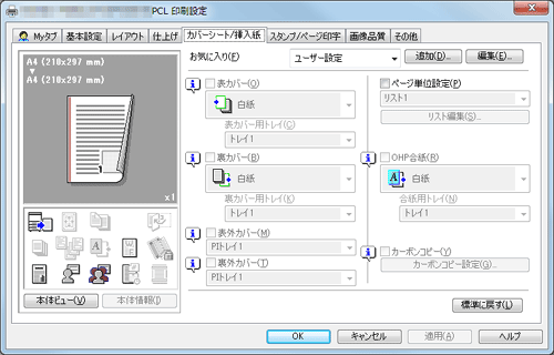 [表カバー] | 表紙を挿入して印刷するときにチェックをつけます。あわせて、[表カバー用トレイ]で、表紙用の給紙トレイを選びます。また、表紙として挿入した用紙に印刷するかどうかを選びます。