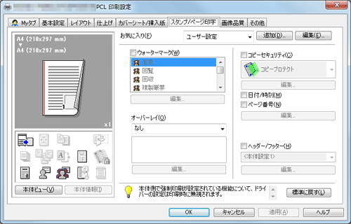 [装置の画像を印刷](PCLのみ) | 本機に登録されているオーバーレイ画像を、原稿に合成して印刷します。 [編集...]をクリックすると、オーバーレイ画像の追加や削除、オーバーレイ画像の合成方法の変更ができます。詳しくは、こちらをごらんください。 | |