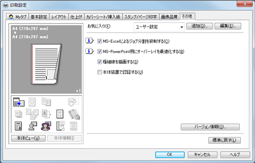 [その他]タブでは、ドライバーのバージョン確認やアプリケーションソフトウェアの印刷設定ができます。