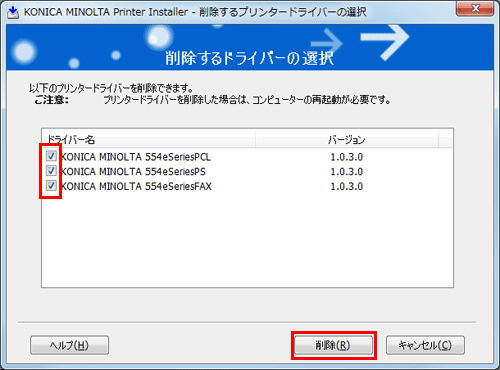 スタートメニューから[すべてのプログラム](または[プログラム])-[KONICA MINOLTA]-[554eSeries(PS_PCL_FAX)] /[554eSeries(XPS)]-[プリンタードライバーの削除]をクリックします。