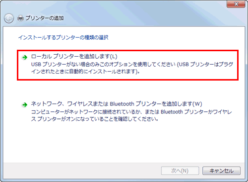 [このコンピュータに接続されているローカル プリンタ]を選び、[次へ >]をクリックします。