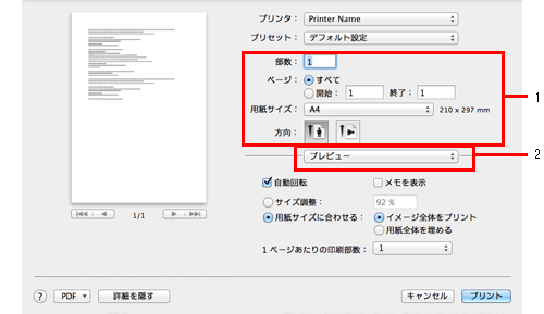 Mac OS X 10.5/10.6をお使いの場合に、設定項目(1)が表示されていない場合は、[プリンタ:]右側の