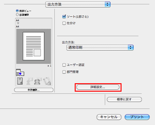 [出力方法]画面の[詳細設定...]をクリックします。