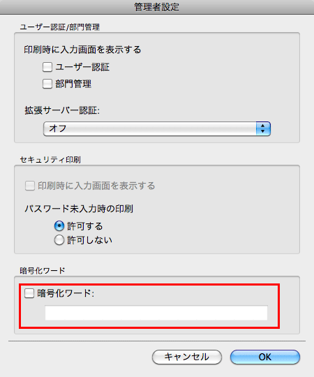 印刷するとき、お使いの機能によっては、ユーザーパスワードや部門パスワードのような認証パスワードを送ることがあります。パスワードは、本機にあらかじめ設定されている暗号化ワードを使って暗号化されますが、必要に応じて、暗号化ワードを変更できます。