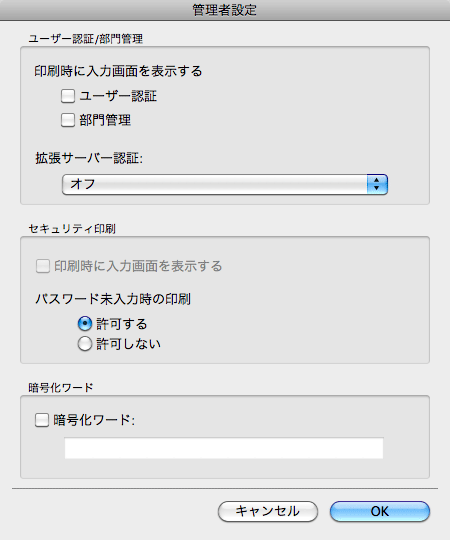 [管理者設定] | 認証設定の入力ダイアログの表示設定や、暗号化ワードを変更するダイアログを表示します。 Mac OS X 10.9でサンドボックス対応アプリケーションをお使いの場合、この機能は利用できません。 |