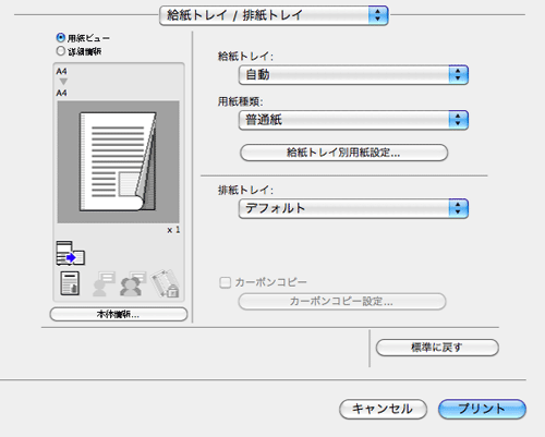 [給紙トレイ別用紙設定...] | 印刷する用紙の種類を給紙トレイ別に指定します。 [給紙トレイ]を選び、[用紙種類:]を変更します。本機の給紙トレイにセットされている用紙の状態と合わせてください。 |