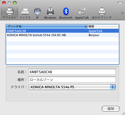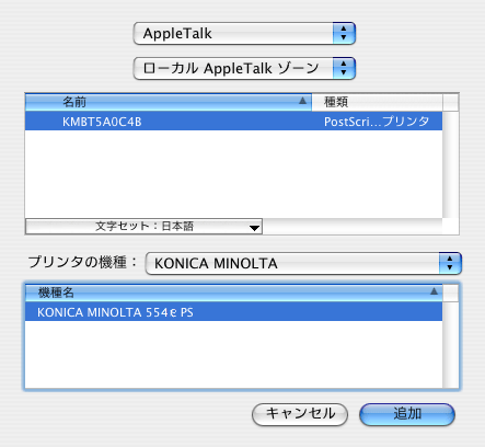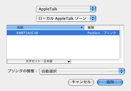 [プリンタ名]一覧から、AppleTalk接続された目的のプリンターを選びます。