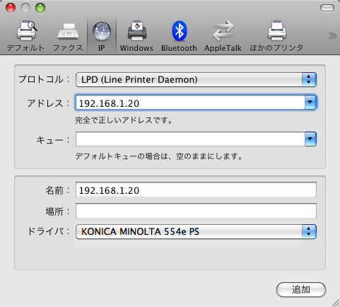 [プリンタのアドレス:]に本機のIPアドレスを入力します。