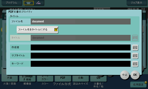 PDFファイルのプロパティを設定するときは、ファイル形式として[PDF]または[コンパクトPDF]を選び、[PDF詳細設定]-[PDF文書のプロパティ]で、次の設定をします。