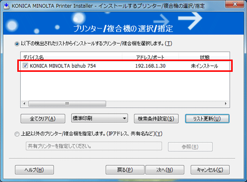 本機の接続が認識できないときは、リストに表示されません。この場合は、[上記以外のプリンター/複合機を指定します。(IPアドレス、共有名など)]を選び、手動で本機のIPアドレスやホスト名を指定してください。