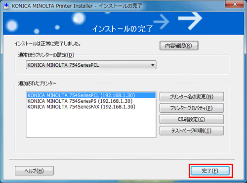 必要に応じて、プリンター名の変更やテストページを印刷し、[完了]をクリックします。