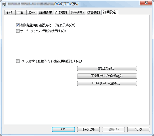 [禁則発生時に確認メッセージを表示する] | ファクスドライバーで同時に使えない機能を設定したときにメッセージを表示する場合は、チェックをつけます。 |