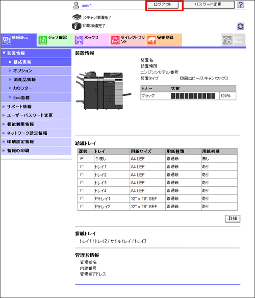 [管理者(ユーザーモード)] | 本機の管理者が、管理者権限を持つユーザーとしてログインするモードです。このモードでログインしたときは、本機の設定は変更できません。 ログインするには、管理者パスワードの入力が必要です。 このモードでは、ジョブを削除できます。 | |