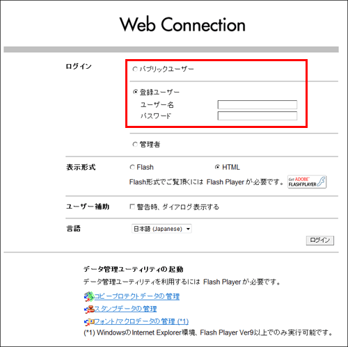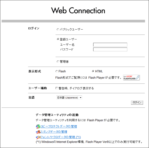 Web Connectionにアクセスすると、最初に表示される画面です。ユーザー名などの必要な情報を入力して、Web Connectionにログインします。