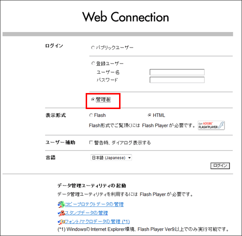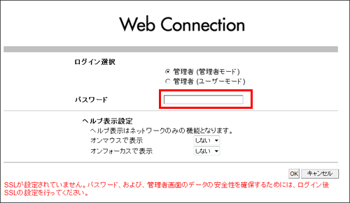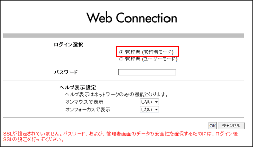 Web Connectionのログインモードには、本機の設定を行う「管理者モード」と、本機の機能を利用する「ユーザーモード」の二種類があります。