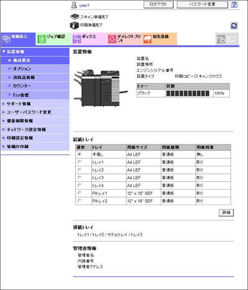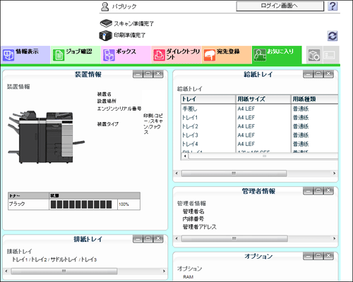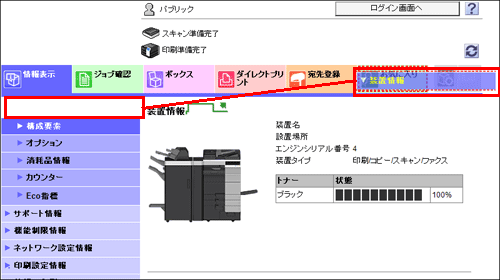 [装置情報] | 本機の構成要素、オプション、消耗品情報、カウンター、Eco指標を確認できます。 |