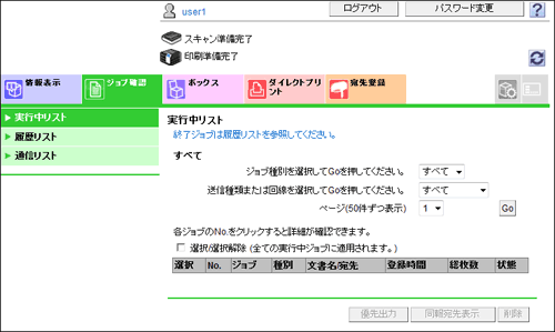[実行中リスト] | 本機で実行中および実行待ちのジョブを確認できます。 |