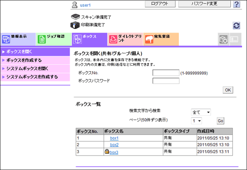 [ボックスを開く] | ボックス(共有/個人/グループ)を開き、保存されているファイルを印刷、送信、ダウンロードしたり、ボックスの設定を変更したりできます。 ボックス内のファイルの利用について詳しくは、こちらをごらんください。 |