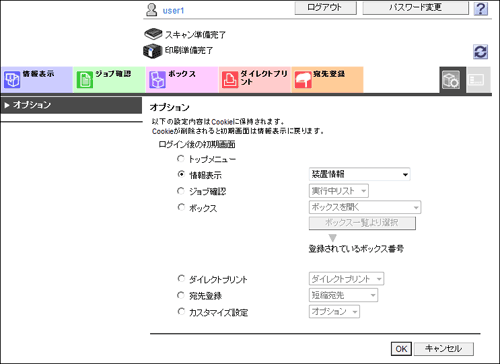 [ユーザー認証/部門認証の連動] | ログインしているユーザーが、自分のユーザー認証と部門認証の連動設定を変更できます。 |