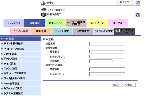 [管理者登録] | 本機の管理者の情報を登録します。 | |