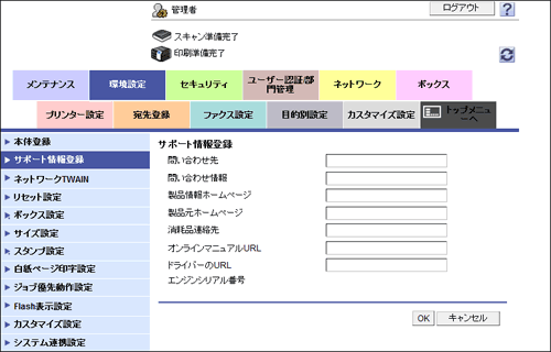 管理者モードの[環境設定]-[サポート情報登録]で、次の設定をします。