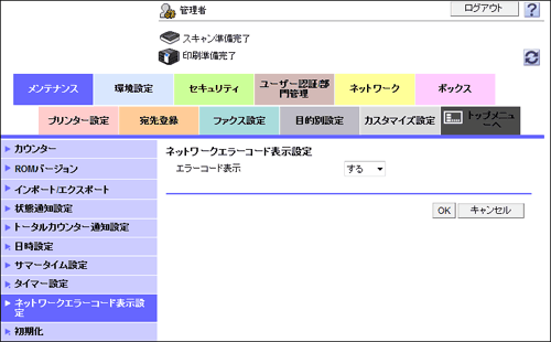 管理者モードの[メンテナンス]-[ネットワークエラーコード表示設定]で、[エラーコード表示]を[する]に設定します(初期値:[しない])。